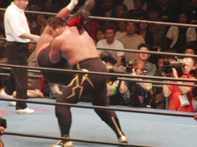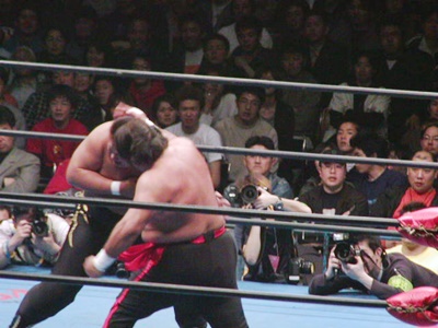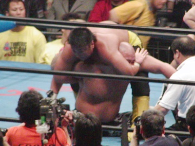 ロックアップ、嵐がロープに押し込む、クリーンブレーク。再度ロックアップ、橋本ヘッドロック、嵐ロープに振る、橋本ショルダーブロック、嵐耐える。ここからショルダーブロック合戦、嵐が優勢(右写真)。橋本キック、嵐ブロックしてショルダーブロックで橋本を場外に吹っ飛ばす。嵐は場外に橋本を追いかけて鉄柵、鉄柱にぶつけリングに戻す。