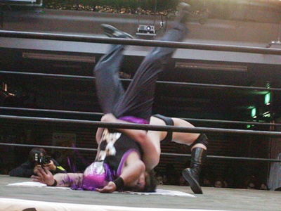大家ストンピング、コーナーに振って串刺しラリアット、ダブルアームスープレックス(右写真)からバタフライロックに。宇宙ロープ。
