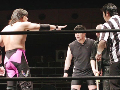 当然のようにサンダーと2人で入ってくる橋本。GENTAROはサンダーを下げるように主張するが(右写真)ノーDQルールのためその主張は認められない。