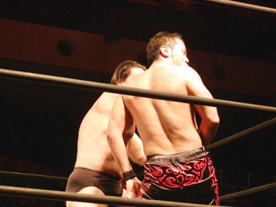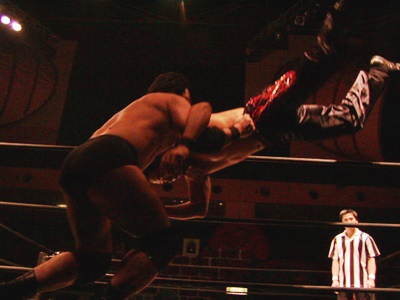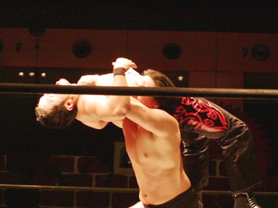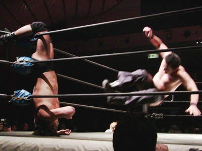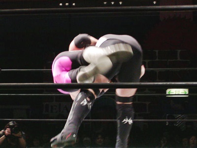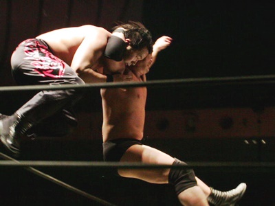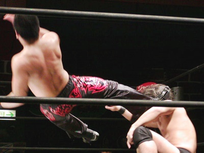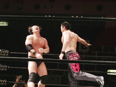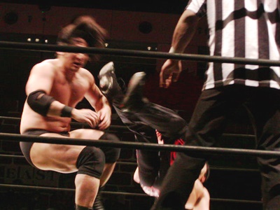 橋本凄い角度の裏投げ、カウント2。橋本STO(右写真)、カウント2。橋本バック取る、GENTARO切り返す。GENTAROソバット、コーナーに詰めてパンチ連打からディスカス張り手。
