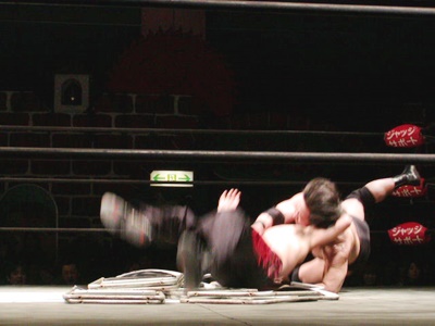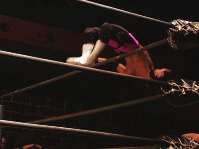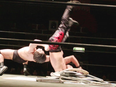 高木はコーナーのロープの間にイスをセット、佐々木を担いで頭からぶつけようとするが佐々木は着地して高木をイスにぶつける。佐々木コーナーに上ってスイングDDT(左写真)