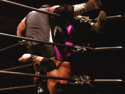 佐々木はコーナーに逆さ吊りにしてドロップキック、高木腹筋で起き上がってかわす。高木フェースロック、佐々木ロープ。佐々木場外エスケープ。高木イスをリング内に投げ入れて佐々木を戻す。コーナーに逆さ吊りにして急所蹴り(右写真)