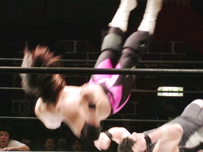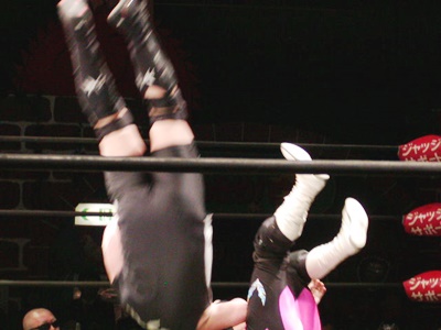 佐々木ボディスラム、コーナーに上る。高木も上ってホイッパースナッパー(右写真)、カウント2。