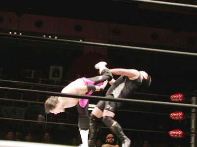 GENTAROバック取る、橋本切り返して投げっ放しジャーマン(左写真)。