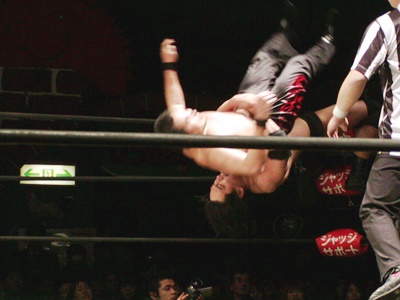高木ベストを脱ぐ前に真空飛びヒザ蹴りからジャーマン(右写真)、カウント2。三四郎スタナー2000狙うが佐々木は着地してソバット、バキューン!キックからラリアット、カウント2。佐々木D-ガイスト狙うが高木着地して急所蹴り。ベストで佐々木の背中を打つ。