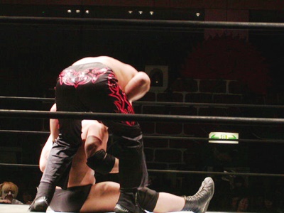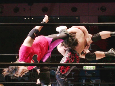 高木カナディアンバックブリーカーに担ぎ上げて(左写真)コーナーにぶつける。足でカバー、カウント2。