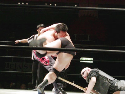 しかし佐々木はすぐに立ち上がるとラリアット、カウント2。佐々木再度D-ガイスト狙う、ここでようやくサンダーが介入、竹刀でD-ガイストを阻止(右写真)。