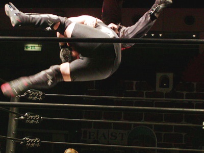 橋本ロープに振ってラリアット、GENTAROかわしてフライングエルボー、橋本場外転落。GENTAROはラ・ケブラーダで追撃(右写真)。場外でサンダーにキック、橋本にパンチ。橋本の肩口にキック、肩から鉄柱にぶつける。サンダーがGENTAROに竹刀攻撃。GENTAROと橋本リングに戻る。