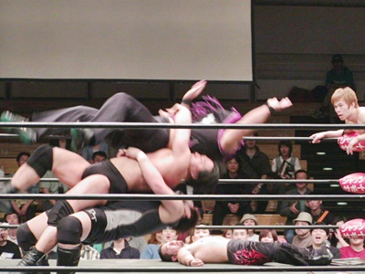 橋本コーナーに振る、佐々木コーナーに飛び乗ってスイングDDT(右写真)、MIKAMIにタッチ。
