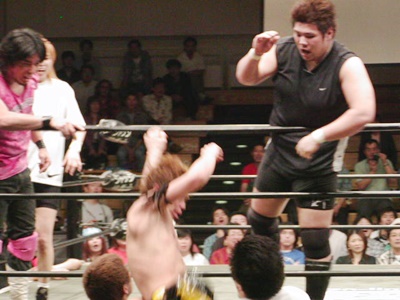 KUDOが入る。正拳突き、スピンキックで橋本を倒してコーナーからダイビングダブルにードロップ、橋本かわす。橋本肩に担ぐ。そのままトップロープ越しに場外に落とす。KUDO失格。ストロベリージャム2vs4と2人リード。20分経過。
