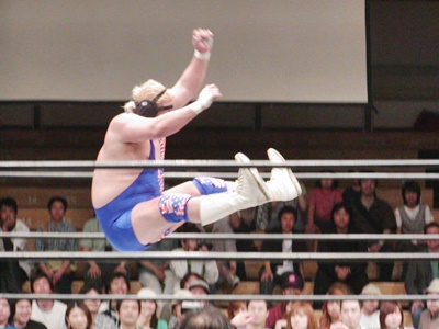 GENTAROパイルドライバーからコーナーに上ってダイビングエルボードロップ(右写真)、カウント2。