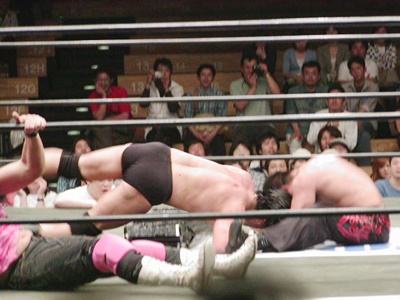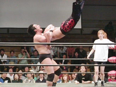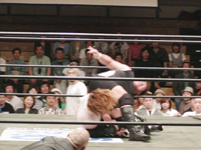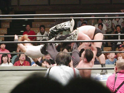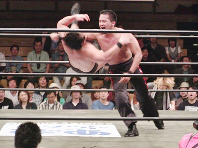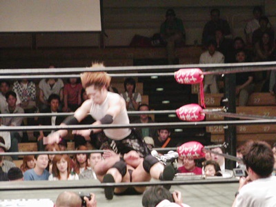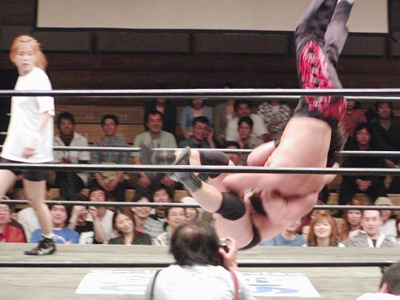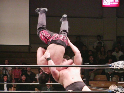 高木はサンダーファイヤーパワーボム、佐々木1で返す。高木は三四郎スタナー2000(右写真)、佐々木これも2で返す。