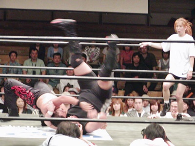 橋本モリガンズ・ボム狙う、MIKAMIスク〜ルボ〜イに、アン偽ルカット。MIKAMIはアン偽ルにドロップキック、橋本にデジャヴ(2回転コルバタ)からスク〜ルボ〜イ(左写真)、カウント3。これで2vs3。