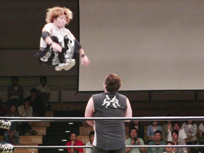 高木とGENTAROがダブルで佐々木をコーナーに振る。まずGENTAROが突っ込む、佐々木かわしてカニばさみ。佐々木はGENTAROにパワーボム(左写真)。そのバックを高木取ってジャーマンに。