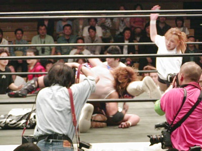 アン偽ルもスク〜ルボ〜イで丸め込む(右写真)、カウント3。これで2vs2のイーブンに。25分経過。