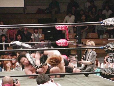 アン偽ル、GENTARO、サンダーを宇宙、MIKAMI、KUDOが蹴散らす。KUDOはGENTAROにトップロープノータッチトペコン。佐々木は高木を捕らえリバース雲龍(右写真)、カウント2。佐々木D-ガイスト、高木2で返す。