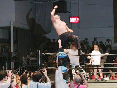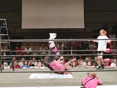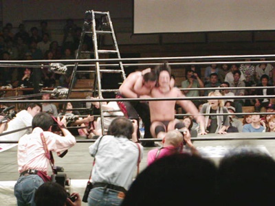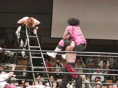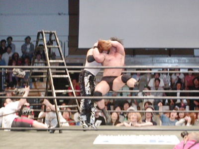 高木もラダーに上るとラダーの頂上からホイッパースナッパー(左写真)。これは凄い。しかしカウントは2。腰に古傷を抱えている高木はこんなことやって大丈夫なのか?しかしラダーマッチではこのような「神!」なムーヴが出てなんぼだし。