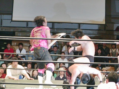GENTAROがイス持って入ってくる。高木が押さえるが佐々木かわしてイスは高木に誤爆(左写真)。