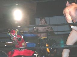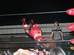 宮崎ドロップキック、ボディスラムからムーンサルトプレスに行くが松尾かわす。松尾はカサドーラ(左写真)、カウント2。