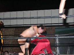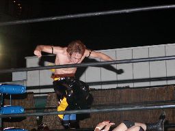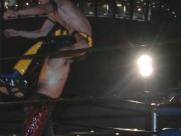 コーナーに上ってダイビングダブルニードロップ(右写真)、カウント3。