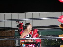 KUDO首投げからサッカーボールキック(右写真)、助走つけてキック2発。柿本気合入れて受けるがソバットを喰らって倒れる。