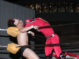 HERO!コーナーに詰めてエルボー、ダブルで対角線コーナーに振ってHERO!がクロスチョップ(右写真)、KUDOカニばさみからキャメルクラッチ、HERO!そこに低空クロスチョップ。5分経過。