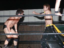 松尾立ち上がってエルボー(左写真)、宮崎もエルボー打ち返す。松尾エルボー、宮崎エルボー、松尾かわしてロープに飛ぶとコルバタ、宮崎場外転落。松尾はコーナーからプランチャ。