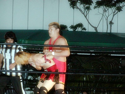 そしてボディスラムからぶーちゃんローラー(左写真)。ぺらんぺらんになる高梨。太カバー、カウント2。5分経過。