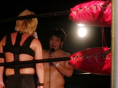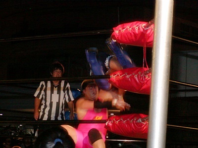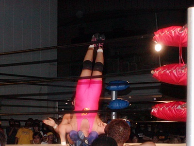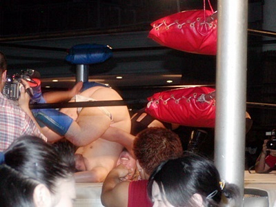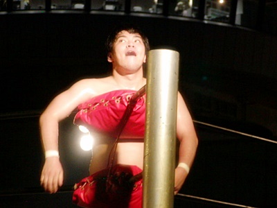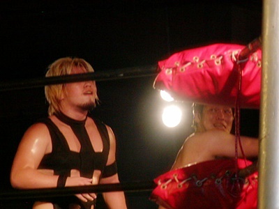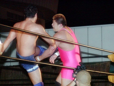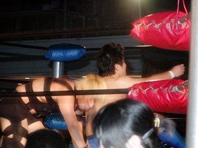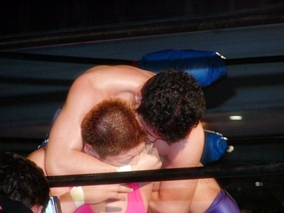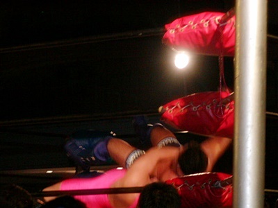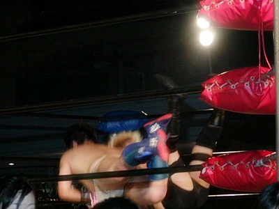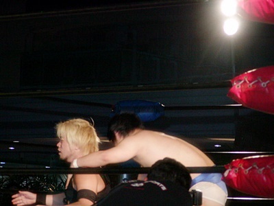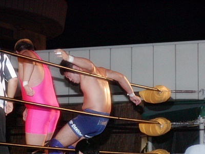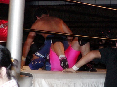 O.K.「男色ターイム!」コーナーに上る。O.K.よろけながらロープにぶつかる、ディーノロープの上を2、3歩歩いてからクロッチ(左写真)。