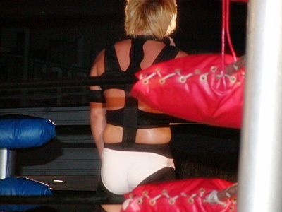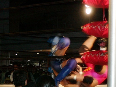 越後ミドルキック連打で坂井をコーナーに追い込む(左写真)。坂井も張り手で応戦、そして珍しいハイキック、いい感じだったが越後は難なくキャッチして裏アキレス腱固めに、坂井ロープ。