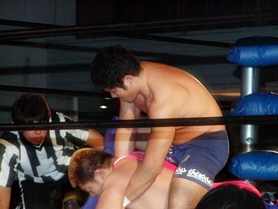 そして男色ドライバー(右写真)、カバーに入るが三浦はまだ復活しておらずカウントが入らない。三浦を起こして抗議するディーノ、O.K.は後ろからスクールボーイ、カウント2。