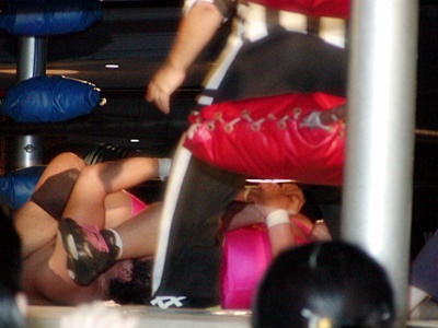 坂井コーナーに上る、越後立ち上がって掌底打って行く。しかし坂井は越後を捕らえるとトップロープ越しの首4の字(右写真)に。