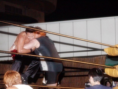 佐々木キック、太「効かない」というポーズ。佐々木さらにミドルキック連打、太耐える。佐々木ローキック。太「アイタ!」倒れる。佐々木十字、諸橋カット。佐々木は森山にタッチ。森山キック連打(左写真)、太ダウン。