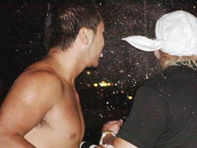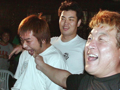 佐々木と一宮はビールの噴き掛け合い(左写真)。