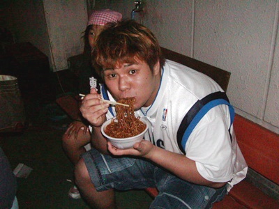「腹減った!」と焼きそばにかぶりつく橋本。