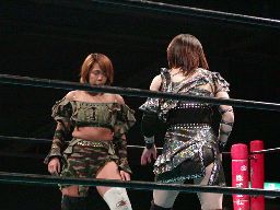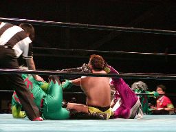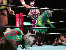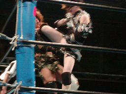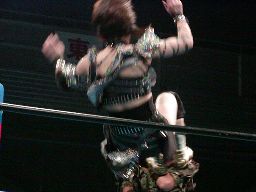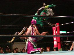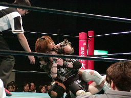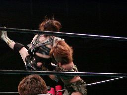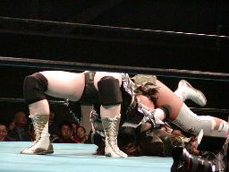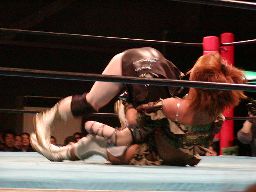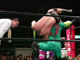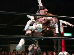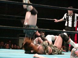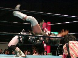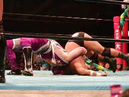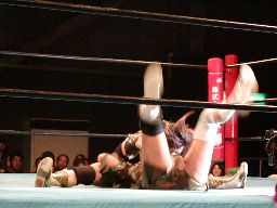チョコが河童を場外に引きずり出して鉄柱やエプロンに顔面ぶつける。リングに戻すとロープに振って駅弁固め、河童ブロック。チョコすると駅弁固め2003(右写真)、カウント2。