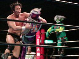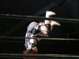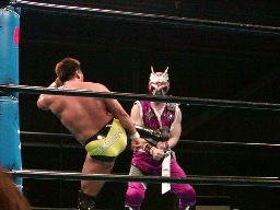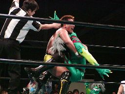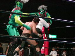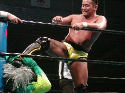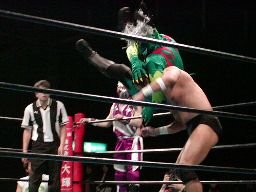 黒田ヌドに固められた河童にカンチョー、ロープで顔面こすり、皿にかみつき。黒田コーナーに振る、河童突っ込んできた黒田にキック、コーナーに飛び乗って飛びつき式ブルドッグ(右写真)、タケルにタッチ。