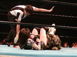 日向もう一発ランニング延髄ニーからみちドラ狙う、三田切り返して垂直落下式ブレーンバスターに(左写真)、カウント2。三田デスバレー宣言して肩に担ぐ、日向エビ固めに丸め込む、カウント2。