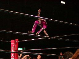 河童ツームストーンドライバーからコーナーに上ってダイビングヘッドバット(右写真)、カウント2。