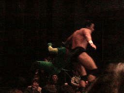 チョップの打ち合いはチョコの勝ち。チョコDDT。ハイキックはタケルかわしてドロップキック、チョコ場外転落。タケル場外にラウンディングボディアタック(右写真)。リングに戻ると河童にタッチ。