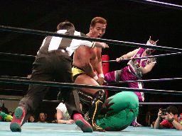 チョップの打ち合い、黒田サミング、チョコにタッチ。チョコカチ上げエルボー3連発、カウント2。エルボードロップ、ミドルキック、黒田に渡すと黒田得意の足殺し。黒田リングに戻すと足4の字固め、ジュニアがカット(左写真)。チョコがリング内にイス入れる。黒田は河童の股間にイス攻撃。10分経過。