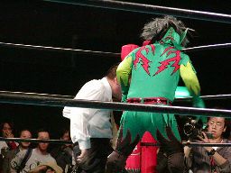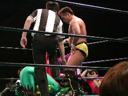 浅野社長ゴングを要請(左写真)、IWA側の反則かとも思われたが裁定はノーコンテスト。
