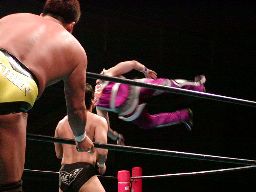日向は三田をリングに戻してコーナーに上る。三田の背中にミサイルキック、そしてジャーマン(左写真)、カウント2。日向みちドラ狙う、三田ブロックしてエルボー、日向低空ドロップキック。