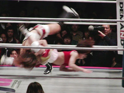 桜花コーナーに上って場外の高瀬にプランチャ(右写真)。リングに戻すとストンピング。首投げからスリーパー、高瀬切り返し、足を取るとキック、ヘッドバット入れてステップオーバートーホールド。ひっくり返してレッグロック、桜花ロープ。