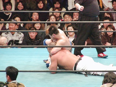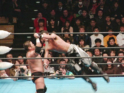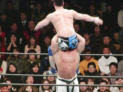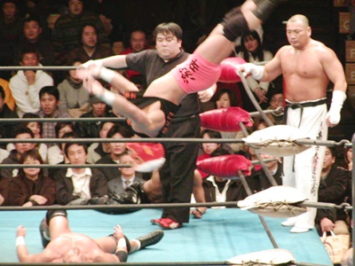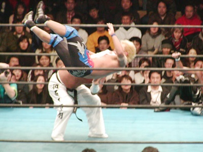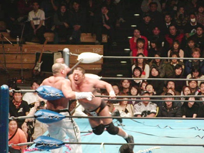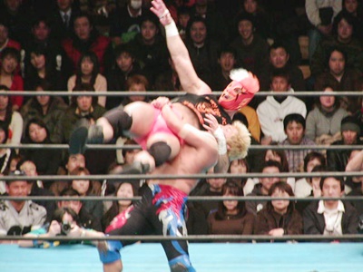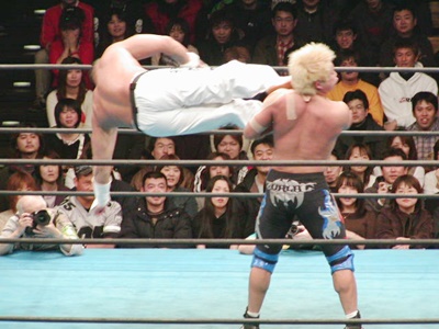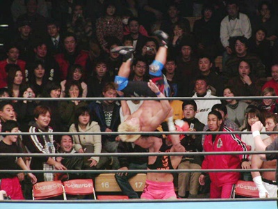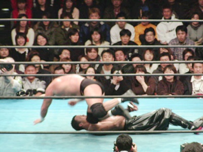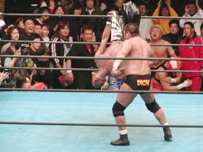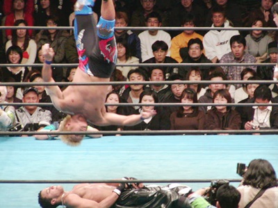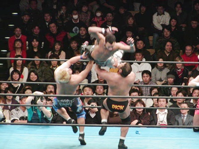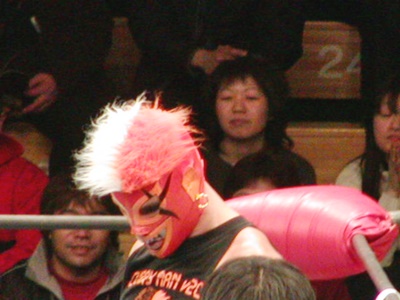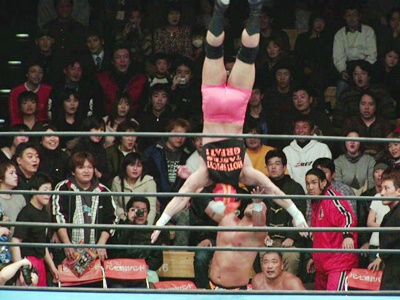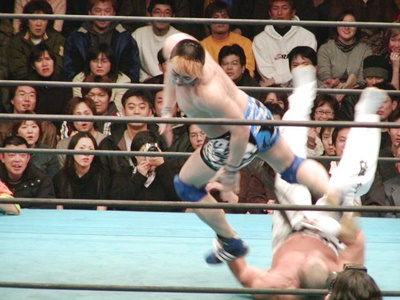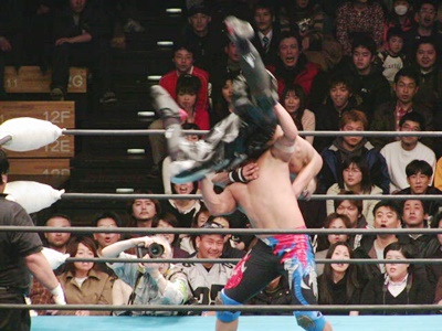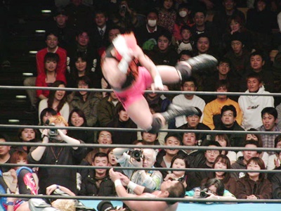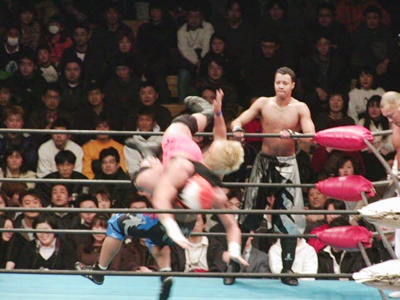 東郷が入ってジョディに首4の字。首4の字がつながるか、と思われたがカレーマンはコーナーからダイビングエルボードロップ(右写真)を東郷に落としてカット。