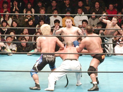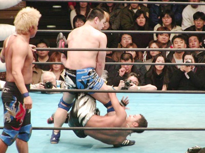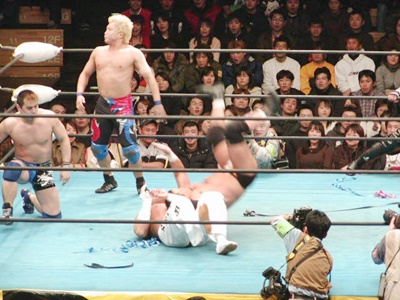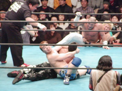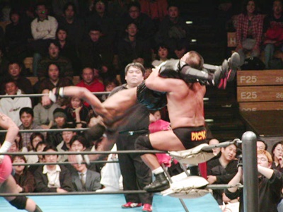 東郷入ってダブルでコーナーに振る、まず東郷が突っ込む、カレーマンかわして走ってきた日高にSTO(右写真)、東郷には延髄蹴り。人生にタッチ。