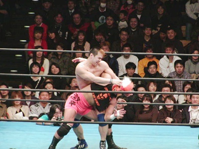 人生ロープに飛ぶ、TAKAがカニばさみで倒しジャストフェースロック(左写真)。人生立ち上がってロープに振る、ラリアットかわしてTAKAはスーパーK。