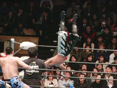 日高ヘッドロック、人生ロープに振る、日高ショルダーブロック、人生倒れず。日高ロープに飛んでもう一発、やっぱり効かず。日高ロープに飛ぶ、人生ラリアット、日高かわしてドロップキック。人生は立ち上がると地獄突き。ロープワークから人生トラースキック、カレーマンにタッチ。カレーマンパンチ、ロープに振ってゼロ戦キック(右写真)、カウント2。