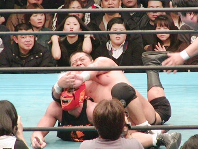 カレーマンロープに振ってラリアット、TAKAかわしてコブラツイスト(左写真)、カレーマンの頭にかみつく。カレーマン切り返すがTAKAすくい投げで投げる。TAKAロープに振る、カレーマンコルバタでTAKAを場外に落としプランチャ。日高がリングイン。カレーマンリングに戻って人生にタッチ。