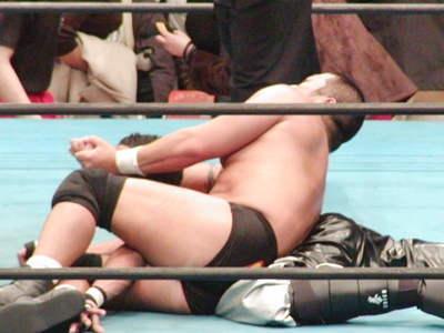 日高ロープに振ってエルボー、さらにエルボードロップ、カウント2。腕ひねり上げて東郷にタッチ。東郷パンチ、ロープに振って逆水平、フィストドロップ、カウント2。東郷グラウンドでスリーパーに(右写真)。カレーマンなんとか立ち上がってエルボーでブレーク、ロープに飛ぶ、東郷カウンターのラリアット。カバーは人生がカット。東郷はTAKAにタッチ。